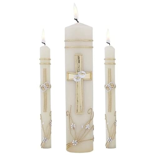 A favorite for sacramental ceremonies, this elegant set includes a primary pillar and matching tapers adorned with gold leaf to symbolize the joining of two lives.